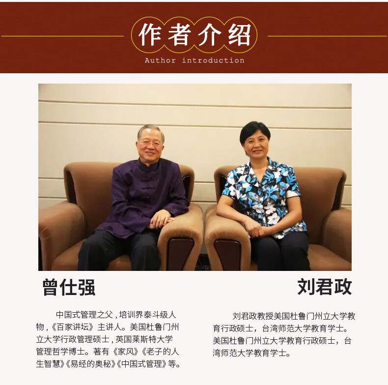 曾仕强,教授,英国莱斯特大学管理哲学博士,人类自救协会理事长,新人类文明文教基金会董事长,台湾交通大学教授,台湾师范大学教授,台湾兴国管理学院首任校长。著有《中国管理哲学》、《中国式管理》、《大易管理》、《如何在36岁以前成功》、《胡雪岩的启示》、《曾仕强剖析胡雪岩商道》等数十种。