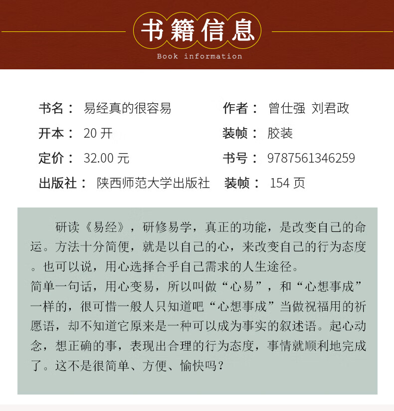 《易经真的很容易》帮您研读《易经》,研修易学,真正的功能,是改变自己的命运。方法十分简便,就是以自己的心,来改变自己的行为态度。也可以说,用心选择合乎自己需求的人生途径。简单一句话,用心变易,所以叫做“心易”,和“心想事成”是一样的。很可惜一般人只知道把“心想事成”当作祝福用的祈愿语,却不知道它原来是一种可以成为事实的叙述语。起心动念,想正确的事,表现出合理的行为态度,事情就顺利地完成了。这不是很简单、方便、愉快吗?二十一世纪,是《易经》重新站上观念思潮舞台的世纪。随着科学与知识的数字化快速发展,在复杂现象中找到简易的原则与道理,已成为知识分子努力的目标。中国管理学大师曾仕强教授以独步全球的《易经》解析观点,让读者轻轻松松掌握《易经》简易、万变的原则,积极管理变化万千的人生。