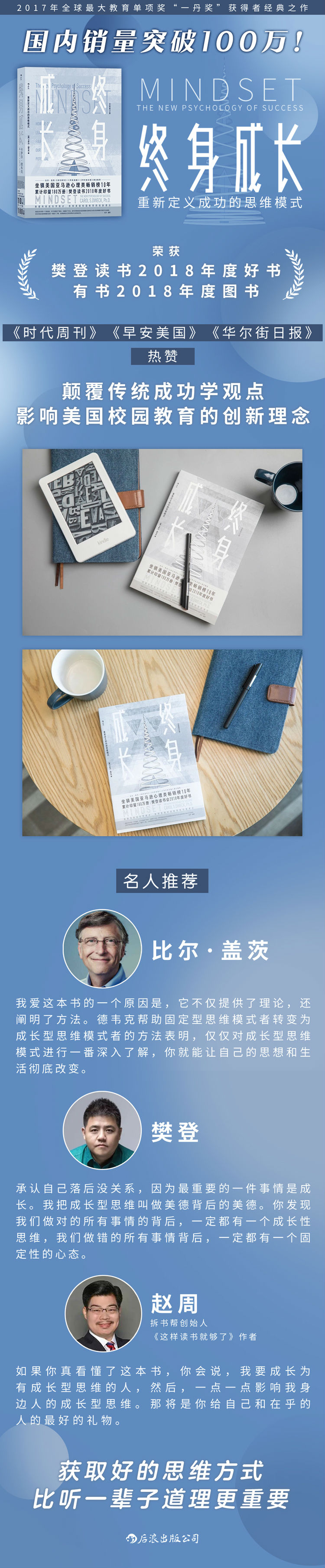 你一旦了解固定型思维和成长型思维的区别,看待他人和自己的方式会有重大的改变。你会期待,招聘有成长型思维的员工,选择有成长型思维的老板;你会规划,相亲时看对方有没有成长型思维,教育子女时也会刻意培养成长型思维。但如果你真看懂了这本书,你会说,我要成长为有成长型思维的人,然后,一点一点影响我身边人的成长型思维。那将是你给自己和在乎的人的好的礼物。