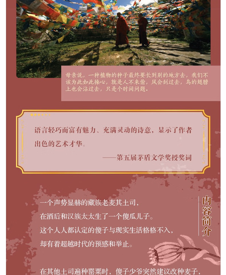 在小说中,一个声势显赫的藏族老麦其土司,在酒后和汉族太太生了一个傻瓜儿子。这个人人都认定的*子与现实生活格格不入,却有着超越时代的预感能力和举止……