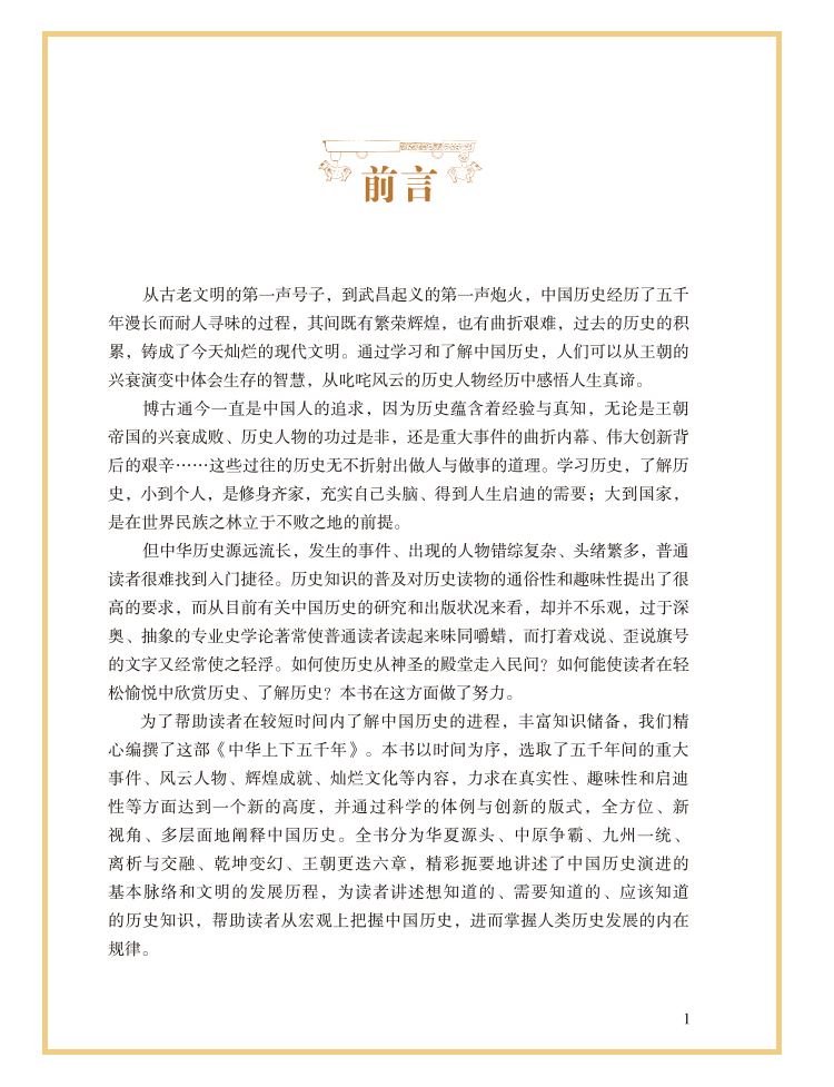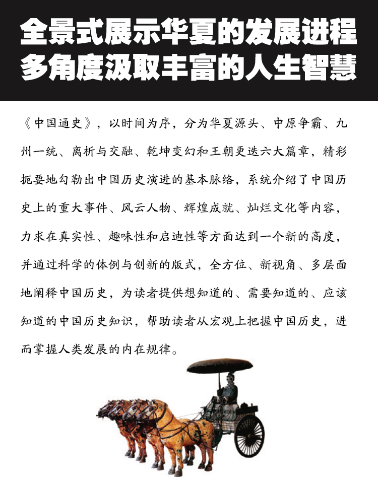 从古老文明的第一声号子,到武昌起义的第一声炮火,中国历史经历了五千年漫长而耐人寻味的过程,其间既有繁荣辉煌,也有曲折艰难,过去的历史的积累,铸成了今天灿烂的现代文明。通过学习和了解中国历史,人们可以从王朝的兴衰演变中体会生存的智慧,从叱咤风云的历史人物经历中感悟人生真谛。