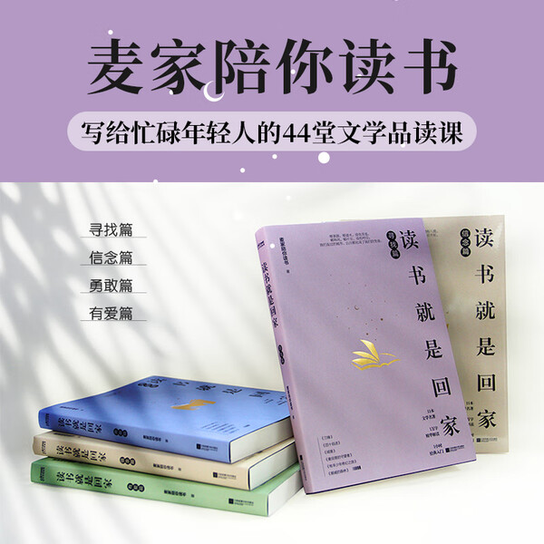 《麦家陪你读书》系列共四册,分别为《读书就是回家 寻找篇》《读书就是回家 信念篇》《读书就是回家 勇敢篇》和《读书就是回家 有爱篇》。