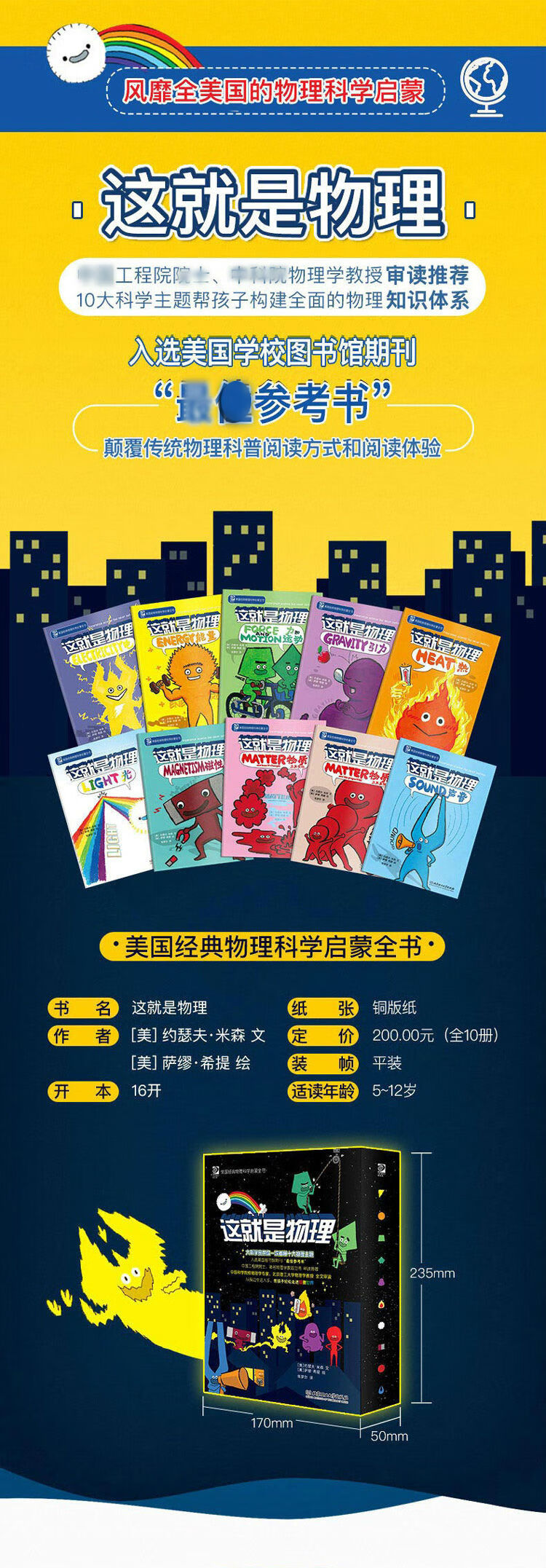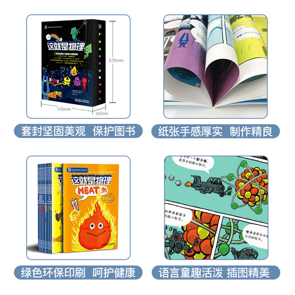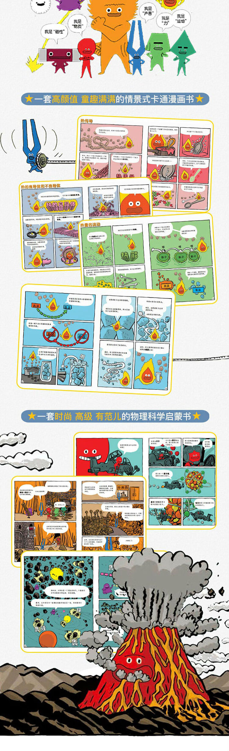 在这套物理科学漫画书中,用不同颜色的卡通角色代表每一种物理学概念,带领读者走进物理世界。文本信息都很简洁,视觉效果也非常清爽,对于初学者来说,能快速、清晰地接触物理主题。 ——《学校图书馆期刊》School Library Journal