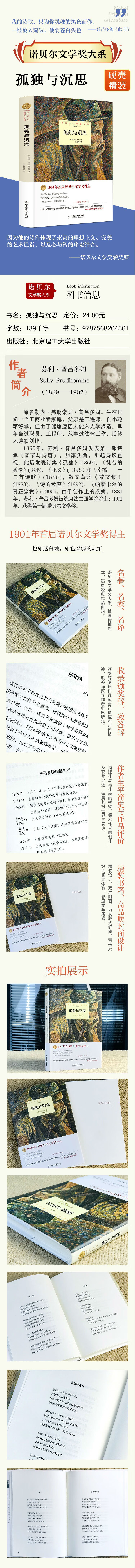 《孤独与沉思》所选均为天才诗人普吕多姆著的代表诗作,例如《天鹅》《眼睛》等在中国广为流传。他的这些诗要么是带有浓郁的抒情气息,来描写孤寂的心境、失恋的爱情,要么是带有一定的哲理性,来探讨人类意识与现代社会的冲突。他与其他诗人不同的另一点就是他对科学的偏好,同时,他的作品还充分表现出对美学和玄学的兴趣。