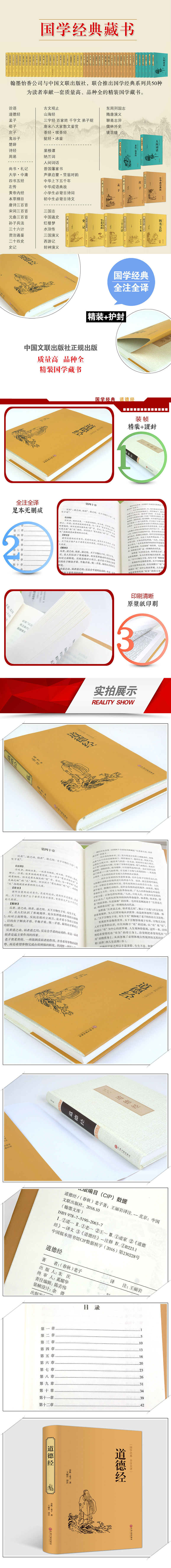 《道德经》又称《道德真经》《老子》《五千言》《老子五千文》,分上、下两篇。上篇《德经》,下篇《道经》。其内容全面丰富,集天文、地理、军事、政治、经济、道德规范、环境保护、自然规律、社会发展、治国用兵、内政外交、仁义礼仪、名利得失、修身养性、学习工作、为人处世等众多内容于一体,荟萃了中华民族春秋时期的文化精髓。