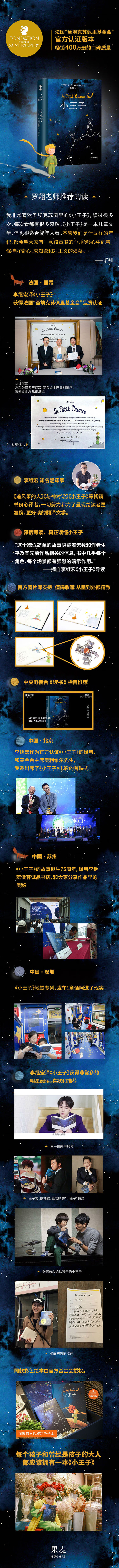 ◆曾经翻译了《追风筝的人》《与神对话》《灿烂千阳》等的李继宏先生,发现很多外国文学不好读并不是原著的"错",而是中文译本出了问题。出于一个专业译者的责任心,他决定重新翻译《小王子》《老人与海》《了不起的盖茨比》《动物农场》《瓦尔登湖》等一系列世界文学名著。用当今的语言、规范的文字、严谨的查证,让译文做到极尽精确;通过深入的文本研究,还原原著或干练或纯真的文字风格,让这些优秀文学作品不再被"误读"。在翻译《小王子》的过程中,李继宏不仅对译文逐字推敲,尽量使用孩子能阅读能理解的词汇,让这一版译文读起来更具童真,同时他还阅读了大量文献资料,撰写10791字导读,带我们走进作者圣埃克苏佩里的传奇世界,透彻剖析《小王子》的古典美和哲学思考。