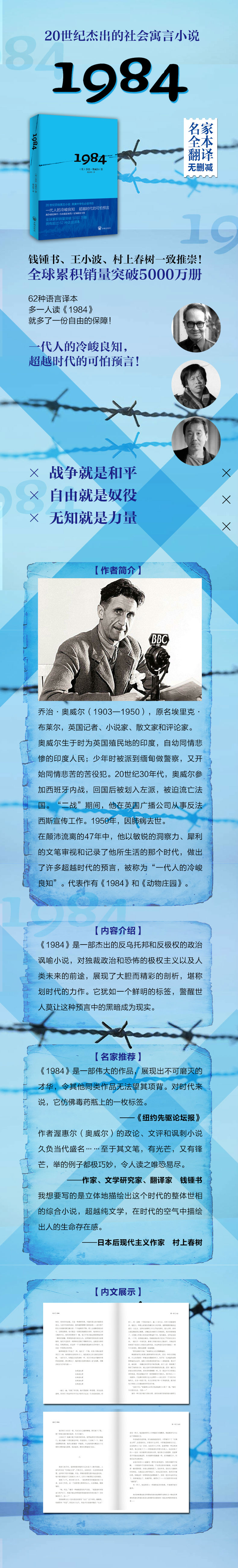 在颠沛流离的47年中,他以敏锐的洞察力、犀利的文笔审视和记录了他所生活的那个时代,做出了许多超越时代的预言,被称为“一代人的冷峻良知”。代表作有《1984》和《动物庄园》。
