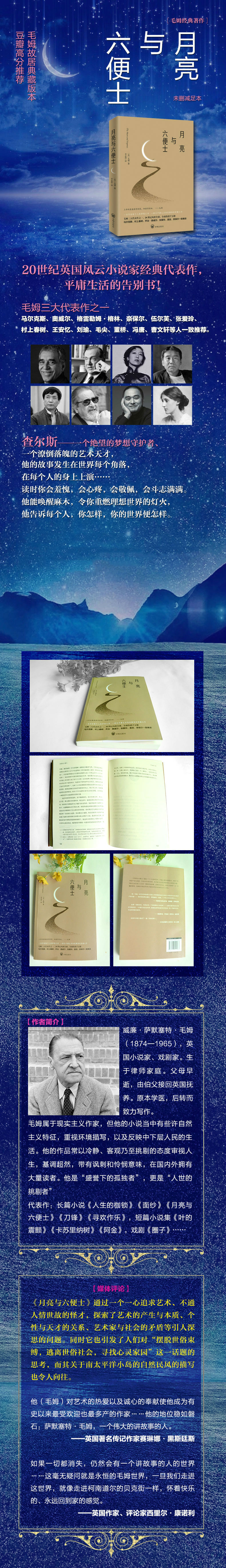 一个英国证券交易所的经纪人,本已有牢靠的职业和地位、美满的家庭,但却迷恋上绘画,像“被魔鬼附了体”,突然弃家出走,到巴黎去追求绘画的理想。他的行径没有人能够理解。他在异国不仅肉体受着贫穷和饥饿煎熬,而且为了寻找表现手法,精神亦在忍受痛苦折磨。经过一番离奇的遭遇后,主人公*后离开文明世界,远遁到与世隔绝的塔希提岛上。他终于找到灵魂的宁静和适合自己艺术气质的氛围。他同一个土著女子同居,创作出一幅又一幅使后世震惊的杰作。在他染上麻风病双目失明之前,曾在自己住房四壁画了一幅表现伊甸园的伟大作品。但在逝世之前,他却命令土著女子在他死后把这幅画作付之一炬。通过这样一个一心追求艺术、不通人性世故的怪才,毛姆探索了艺术的产生与本质、个性与天才的关系、艺术家与社会的矛盾等等引人深思的问题。同时这本书也引发了人们对摆脱世俗束缚逃离世俗社会寻找心灵家园这一话题的思考,而关于南太平洋小岛的自然民风的描写也引人向往。 《月亮和六便士》说问世后,以情节入胜、文字深刻在文坛轰动一时,人们争相传看。在小说中,毛姆用*一人称的叙述手法,借“我”之口,叙述整个故事,有人认为这篇小说的原型是法国印象派画家高更,这更增加了它的传奇色彩,受到了*世界读者的关注。