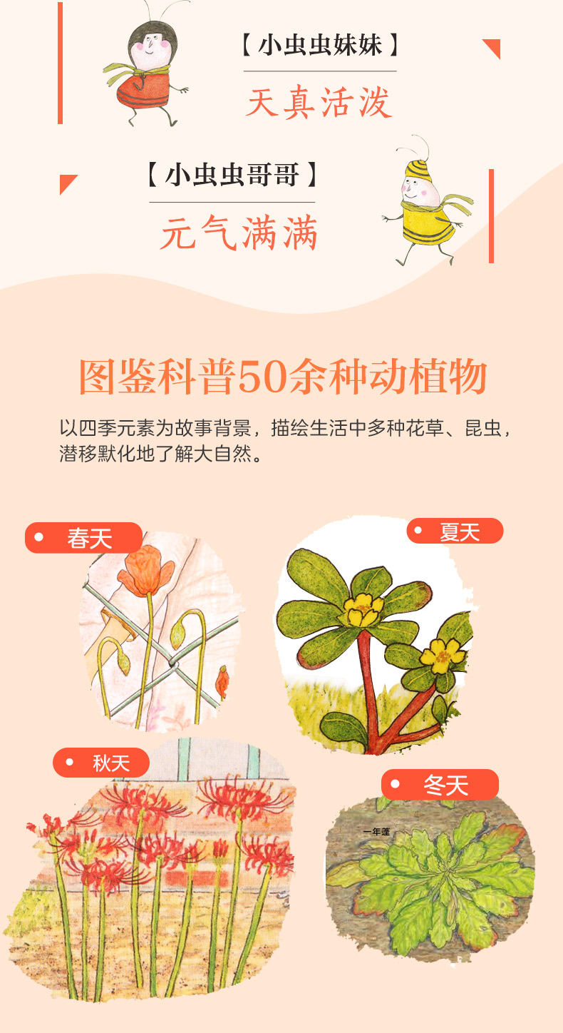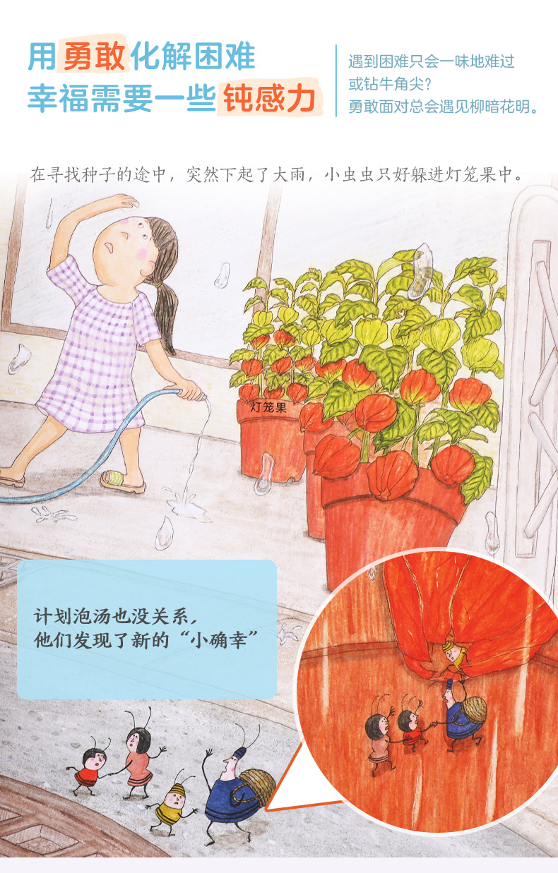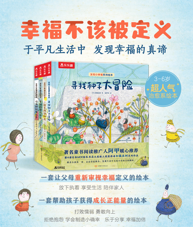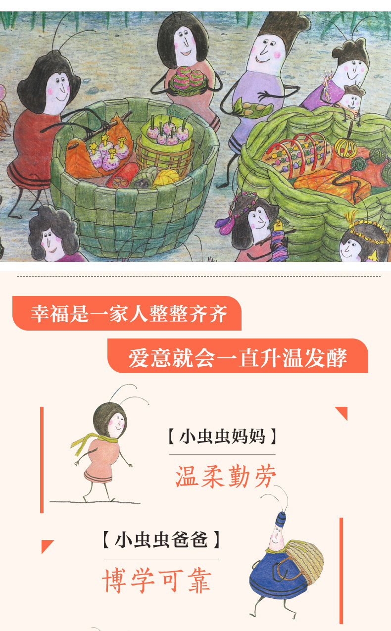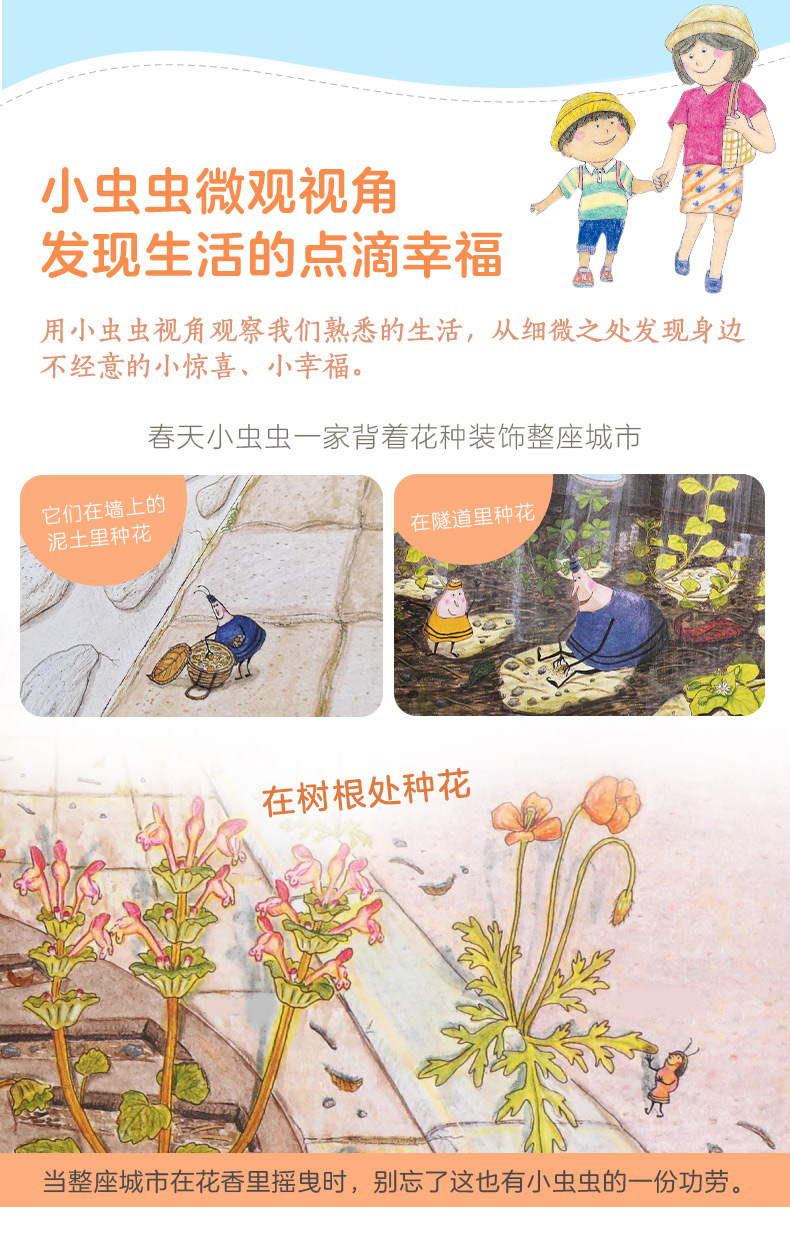 著名雕塑家罗丹有一句流传度高的名言,大意是说,美无处不在,世界并不缺少美,只是缺少发现。投射到如今的快节奏现代社会,被忙碌的工作和各类电子产品裹挟的人们,有多久没有静下心来观察四周了呢?然而对于孩子来讲,他们就和书中的小虫虫一样,充满了冲劲与好奇,身边的一切或许都能成为他们开心的源泉。绘本作家加藤亚树以她温柔细腻的女性作家的笔触,以及独树一帜的绘画风格,描绘出一个个悠闲惬意又积极努力、热爱生活的虫虫形象,引导我们放慢脚步、放缓心绪,重新观察我们自以为熟悉的周遭世界,原来生活中的幸福是那么地触手可及。仔细看,水泥地缝里、墙壁缝隙处、路边花坛中……说不定就能发现虫虫家族忙碌的身影哦~正如日本绘本作家片山健所言,我们所感受到的大自然带来的愉悦,也许就是因为小虫虫们努力为我们做的一切。
