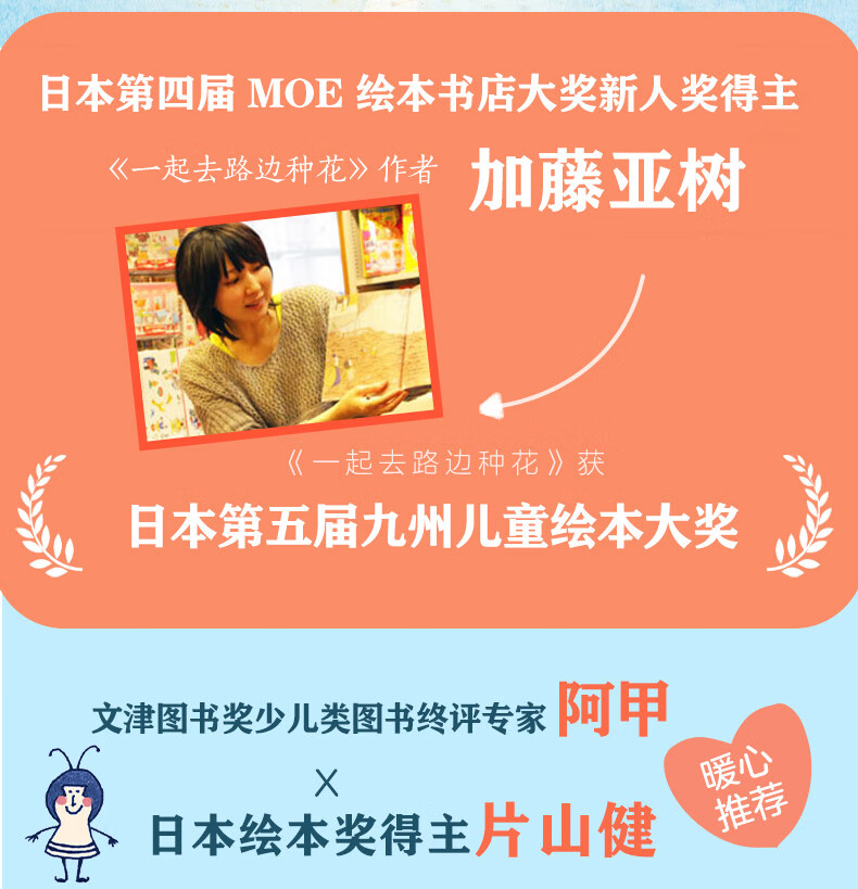 出生于日本东京,从小喜爱绘本。出身于绘本工作室“后先塾”,主要作品有《只是读一读》《亲密地图章收集》等。 “发现小幸福”系列绘本之《一起去路边种花》荣获日本第四届 MOE 绘本书店大奖新人奖和第五届九州儿童绘本大奖。